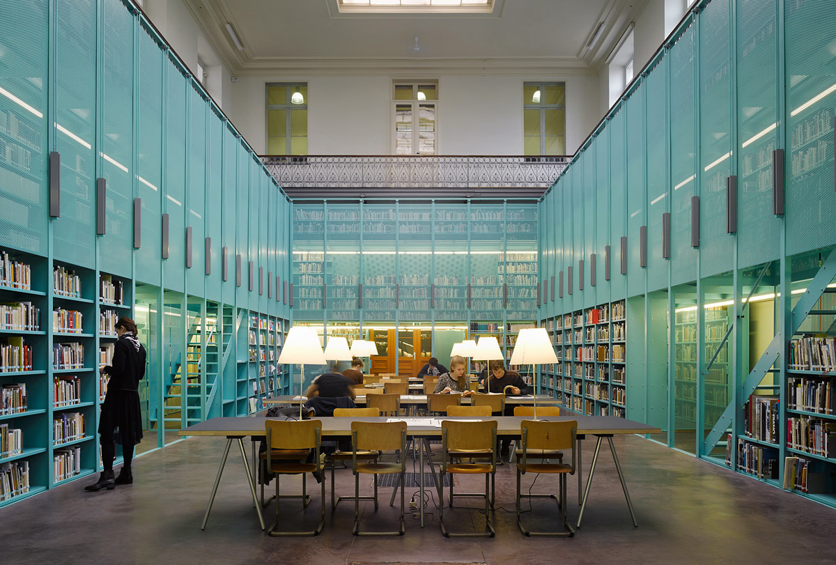 La nouvelle bibliothèque destinée au département Architecture et Urbanisme de l’Université de Gand a été conçue comme un grand meuble à trois étages ressemblant à un pavillon qui occupe l’espace sous le balcon de l’ancienne salle de pratique. Le périmètre de la bibliothèque est délimité par des armoires, en d’autres termes par des livres. En glissant une grille au rythme du périmètre, la collection est accessible ou non afin de protéger les livres lors d’autres activités, comme des réceptions et des lectures, etc. Avec un entraxe de 1 m, de fines ailettes en acier d’une épaisseur de 6 mm se profilent comme les portiques d’un mouvement circulaire qui comporte de nombreuses fonctions. Une plaque modulaire pliée peut être placée en outre dans « le placard » accessible comme radier, étagère, marche et bureau. Tout comme pour les étagères pliées, il était en effet important de conserver la construction aussi finement détaillée, élégante et légère que possible tout en faisant en sorte qu’elle supporte le poids gigantesque des livres.