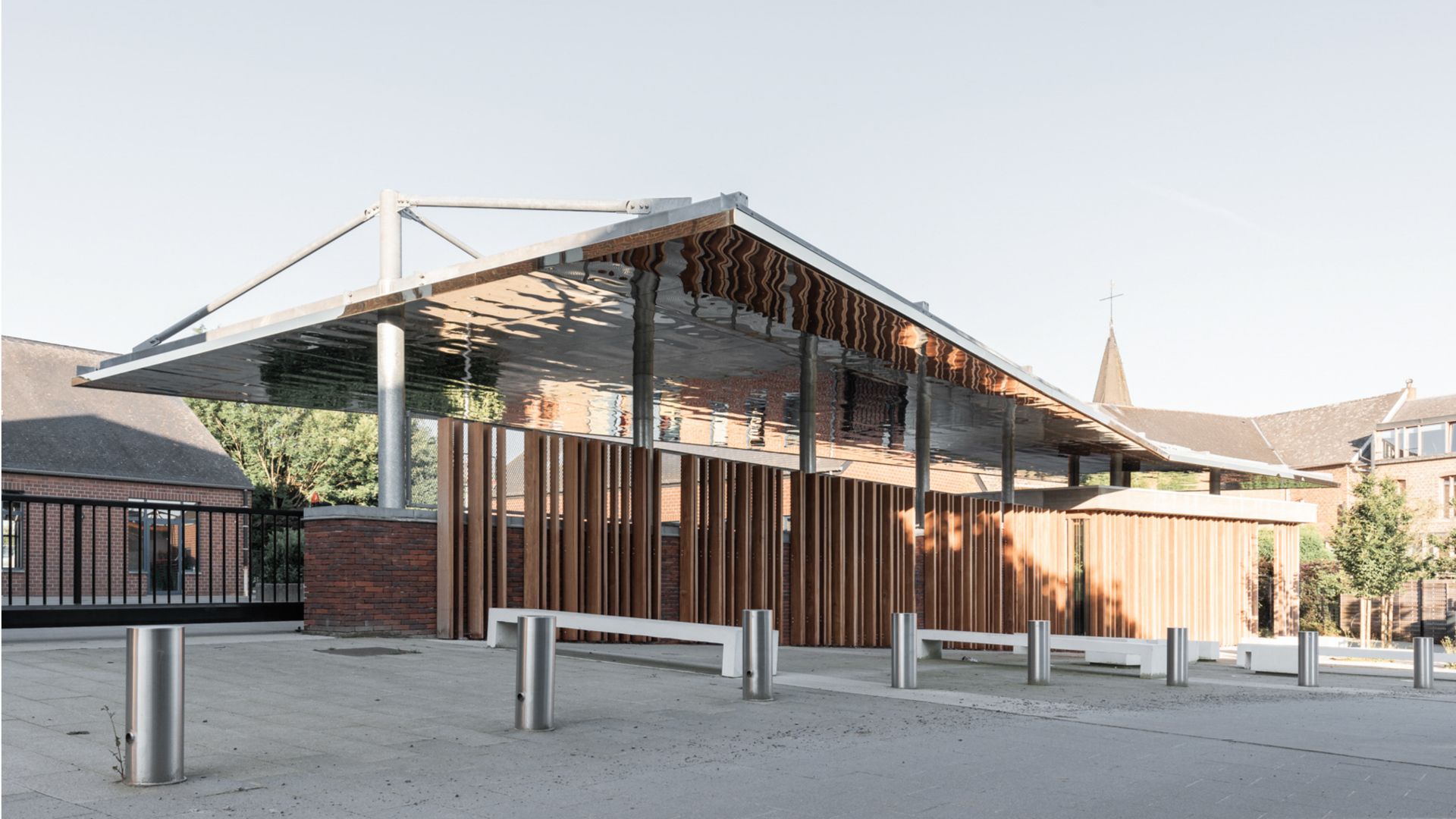 Un mur a été érigé pour marquer la séparation entre la cour de récréation et l’espace de convivialité. Ce mur sert également de point d’ancrage au préau qui surmonte ces deux espaces. Se présentant comme une fine lame d’acier subtilement suspendue à des poteaux, le préau est constitué d’une structure en acier galvanisé à chaud de teinte gris clair (surface de 200 m²). La sous-face en acier inoxydable de teinte or présente un effet miroir qui reflète les activités sous-jacentes, insufflant ainsi à l’ensemble une dimension ludique voire poétique.