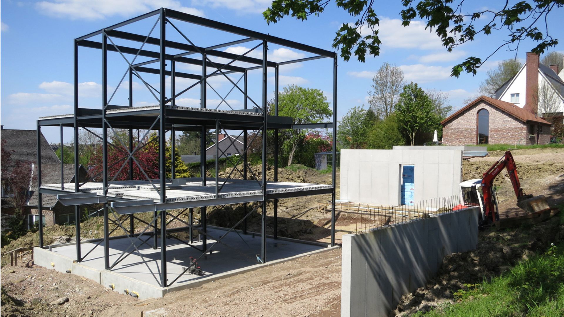 L'accès à l'habitation est rendu possible par un élément de pont autonome et une passerelle en porte-à-faux adjacente à l'entrée latérale. Le pont et la passerelle sont construits avec une structure en acier galvanisé à chaud et des éléments de plancher en béton poli. Le parapet soudé avec un remplissage en métal déployé plat fait partie de la stabilité de l'élément de pont. On accède à l'espace de vie sous des tôles profilées galvanisées par des escaliers soudés en acier plat, avec des marches en bois massif. Le jardin est prolongé au-delà du niveau du sol en pente par une structure flottante avec des caillebotis pressés galvanisés.