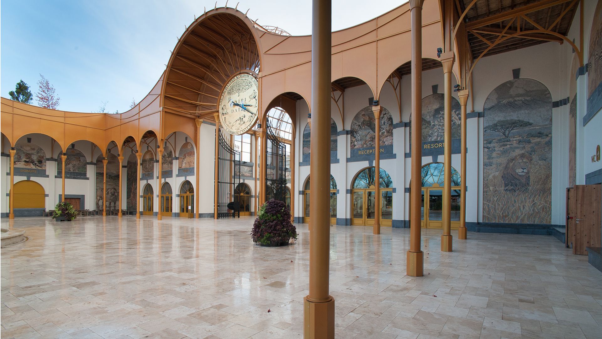 Un chemin couvert de 216 mde long conduit les visiteurs de Pairi Daiza dans un voyage enchanteur jusqu'aux portes d'entrée du parc. Cette entrée majestueuse est une galerie couverte d'acier et de verre, inspirée par le Cristal Palace de Londres, construit en 1851.