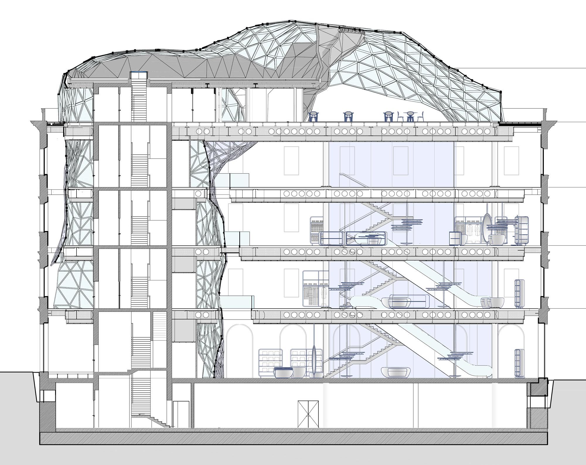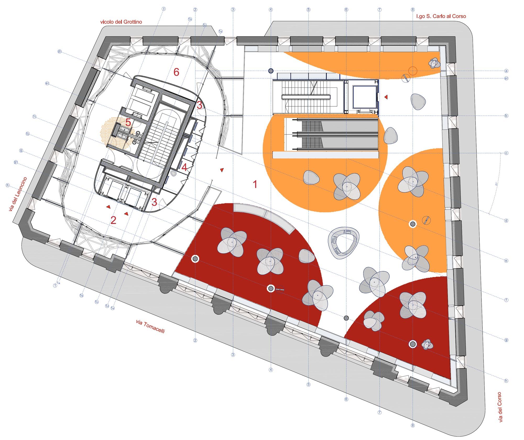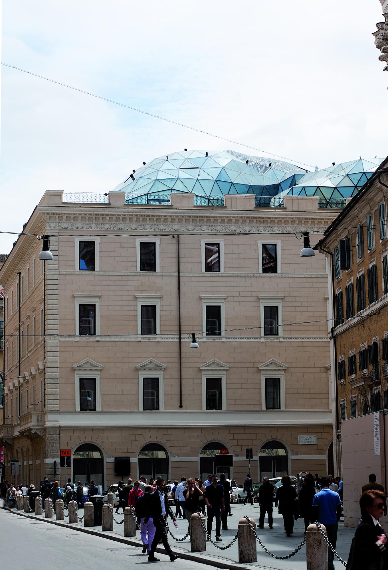 Vanuit architectonisch oogpunt werd het bouwwerk onmiddellijk een eigentijds oriëntatiepunt en een bekende plaatsnaam; het nieuwe dak is tot 8 m hoog in de top en de driehoekige basisgeometrie bevat de verticale verbindingen, dienstruimten, hulpruimten en een deel van de installaties. De hierdoor gecreëerde openheid over de volle hoogte maakt het mogelijk de verschillende verdiepingen te zien, die elk voor het publiek een ruimte openen die wordt gekenmerkt door vloeren versierd met "bellen" van verschillende grootte en kleur, in schakeringen van rood, oranje en paars op een witte achtergrond. De benedenverdieping, ontworpen om een grote winkel te huisvesten, is ook een open en toegankelijke ruimte die de Via Tomacelli verbindt met het aangrenzende plein. Ook het meubilair is ontworpen door Studio Fuksas, hoofdzakelijk in glasvezel en met de nadruk op vloeiende lijnen.