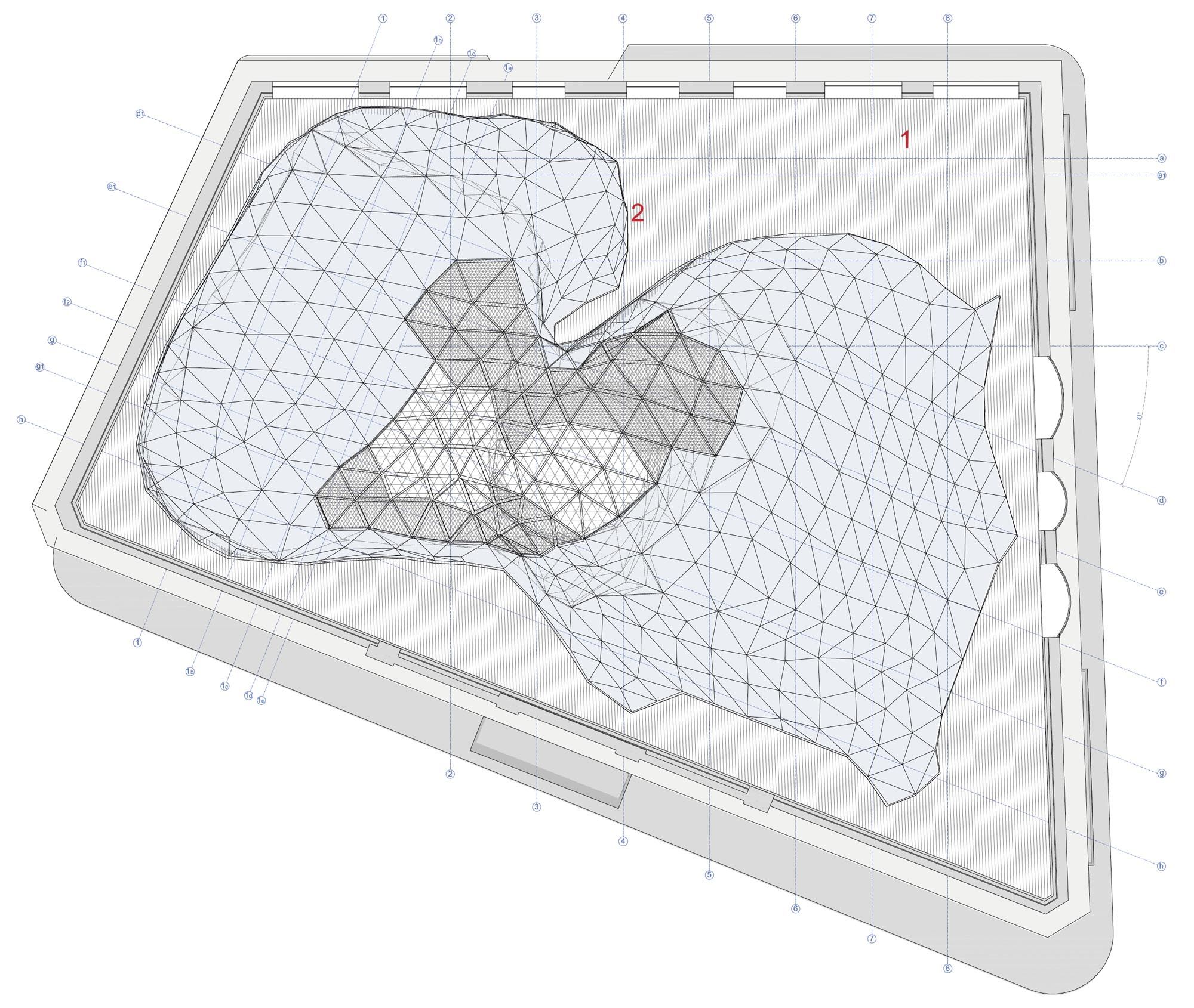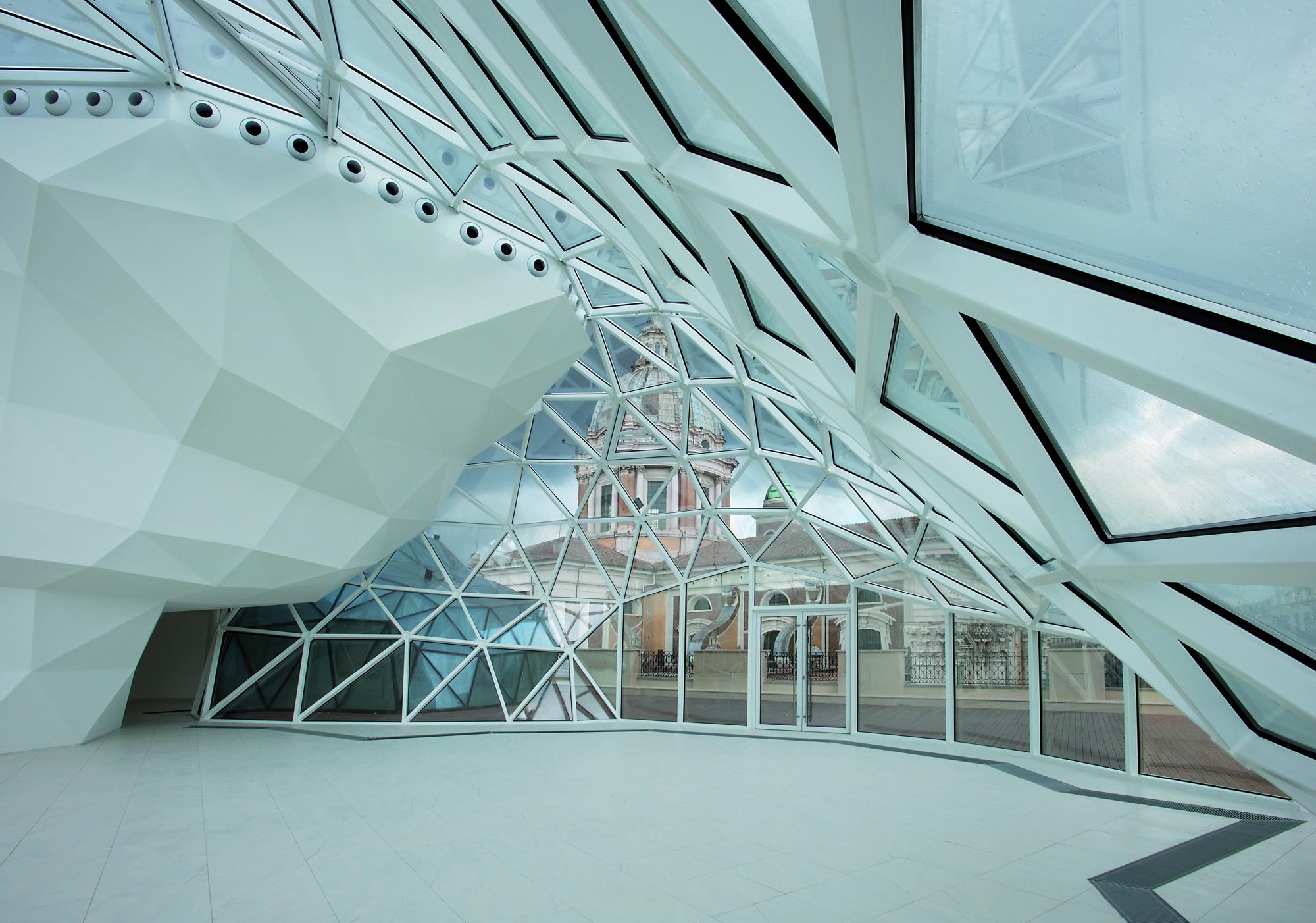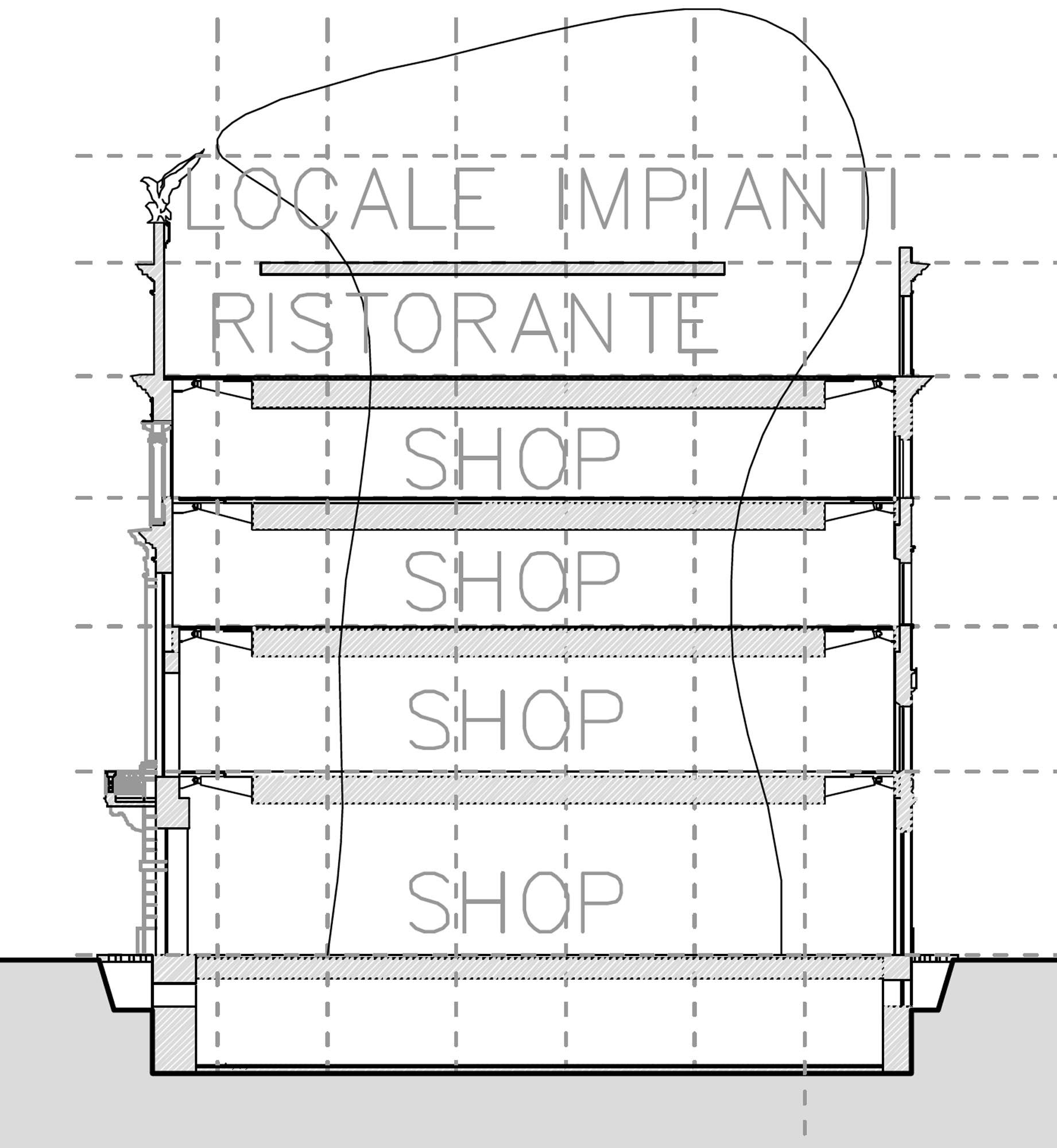 Vanuit architectonisch oogpunt werd het bouwwerk onmiddellijk een eigentijds oriëntatiepunt en een bekende plaatsnaam; het nieuwe dak is tot 8 m hoog in de top en de driehoekige basisgeometrie bevat de verticale verbindingen, dienstruimten, hulpruimten en een deel van de installaties. De hierdoor gecreëerde openheid over de volle hoogte maakt het mogelijk de verschillende verdiepingen te zien, die elk voor het publiek een ruimte openen die wordt gekenmerkt door vloeren versierd met "bellen" van verschillende grootte en kleur, in schakeringen van rood, oranje en paars op een witte achtergrond. De benedenverdieping, ontworpen om een grote winkel te huisvesten, is ook een open en toegankelijke ruimte die de Via Tomacelli verbindt met het aangrenzende plein. Ook het meubilair is ontworpen door Studio Fuksas, hoofdzakelijk in glasvezel en met de nadruk op vloeiende lijnen.