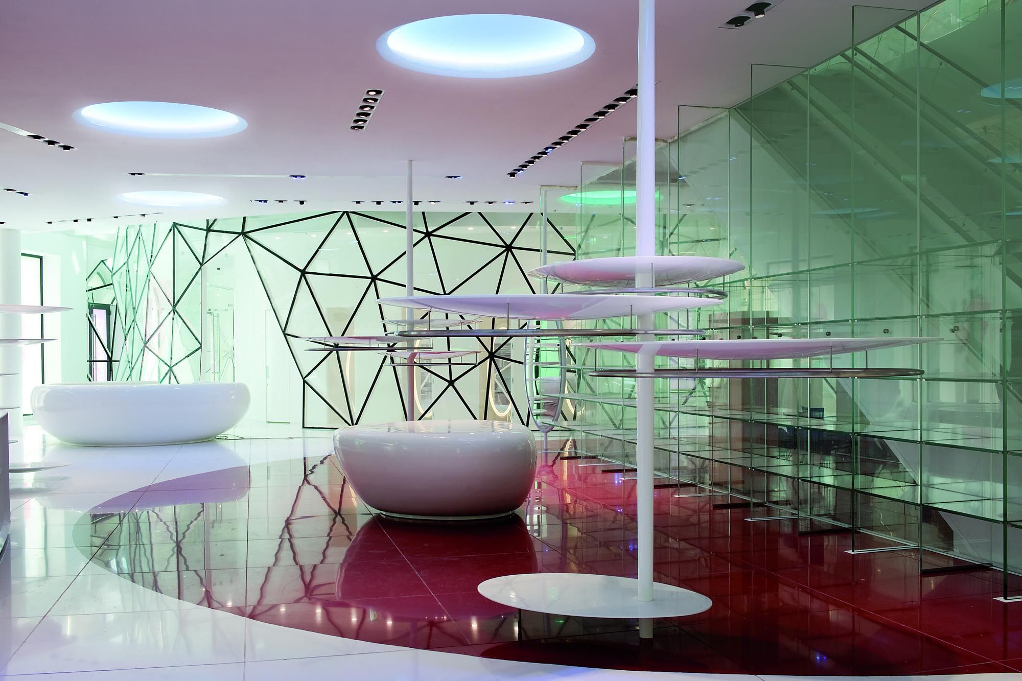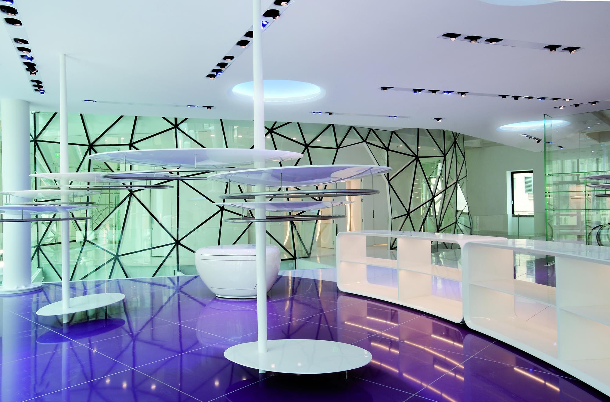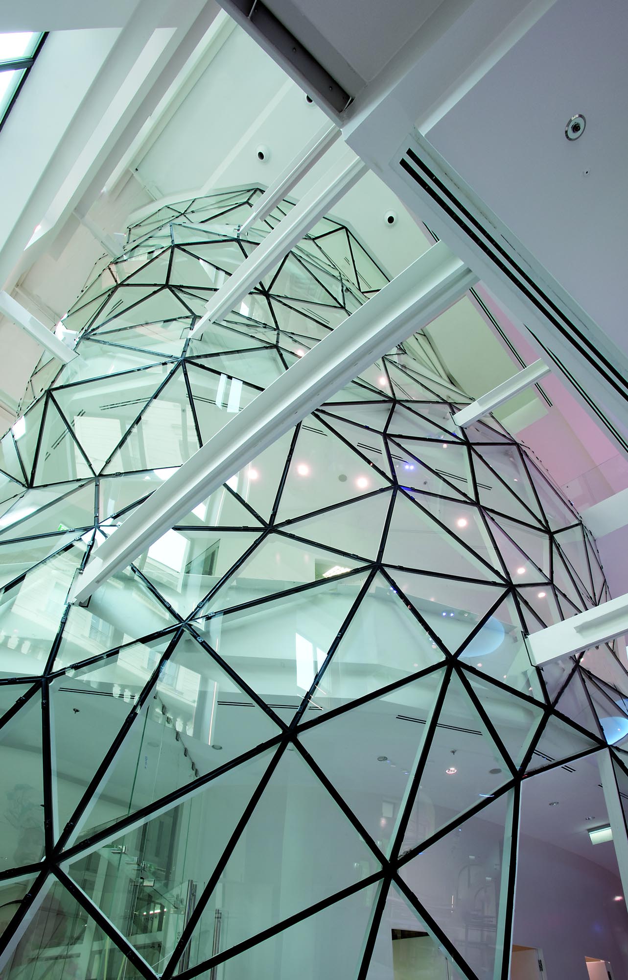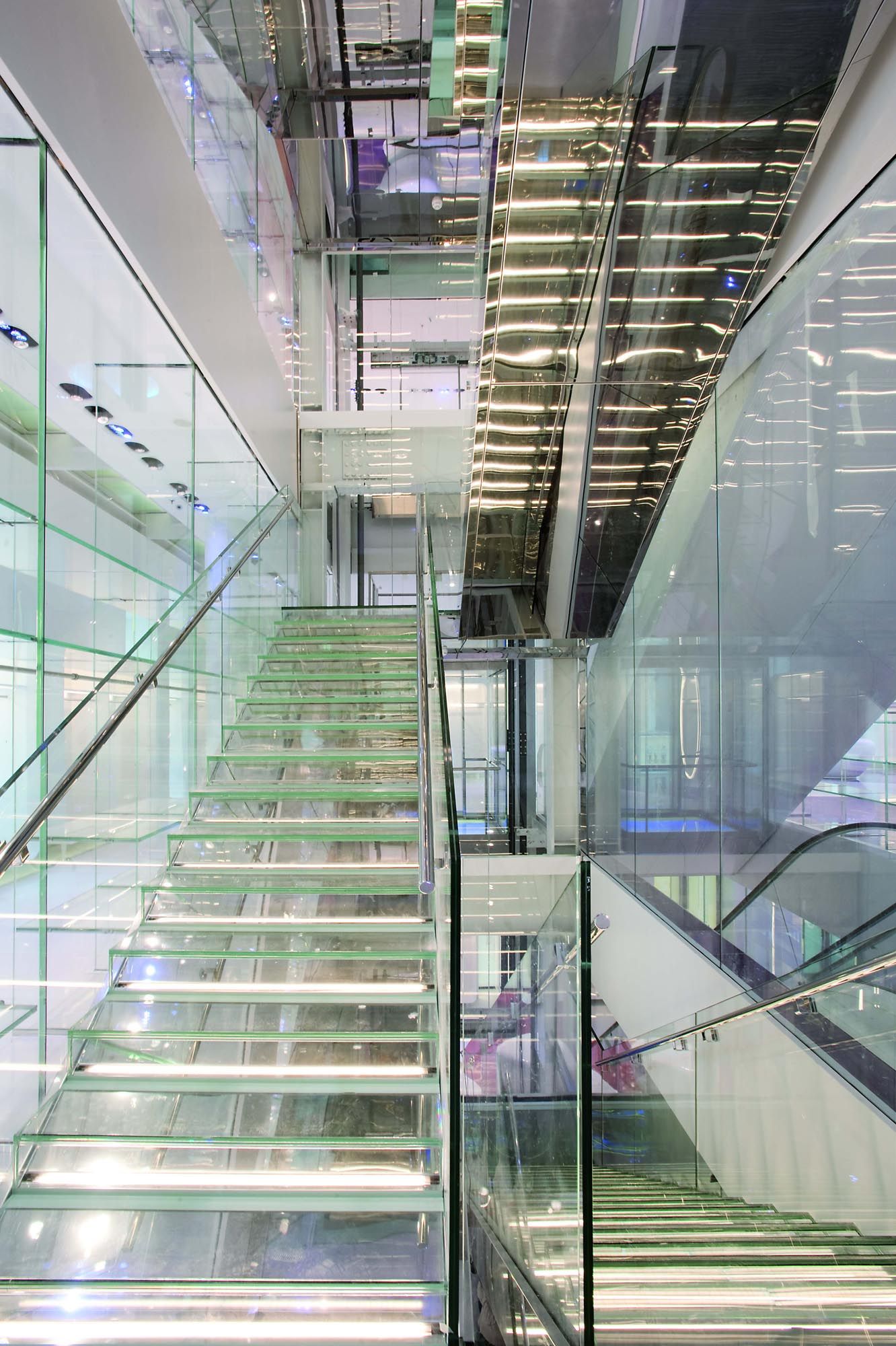 Een trap met door LED verlichte glazen treden en spiegelende oppervlakken vervolledigt het interieurontwerp en verbindt de ruimtes. Ten slotte biedt een glazen vloer op de benedenverdieping zicht op sommige van de archeologische overblijfselen die tijdens de werkzaamheden aan het licht zijn gekomen.
