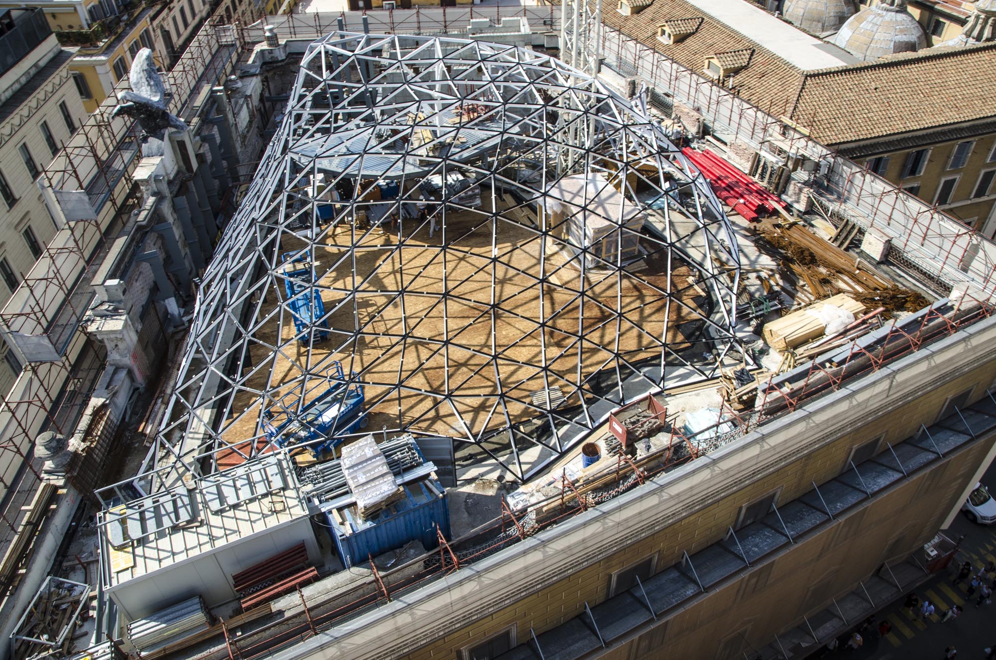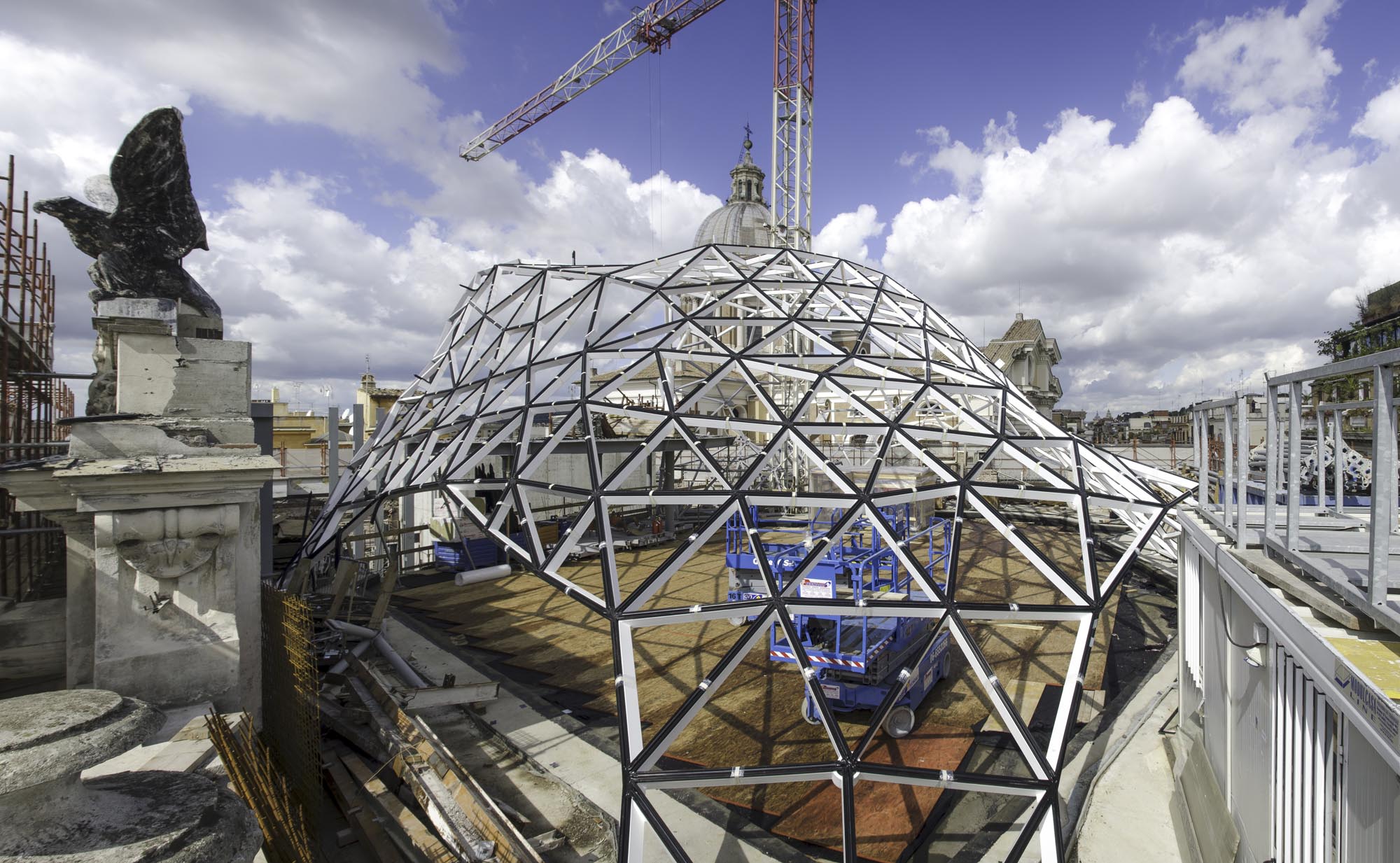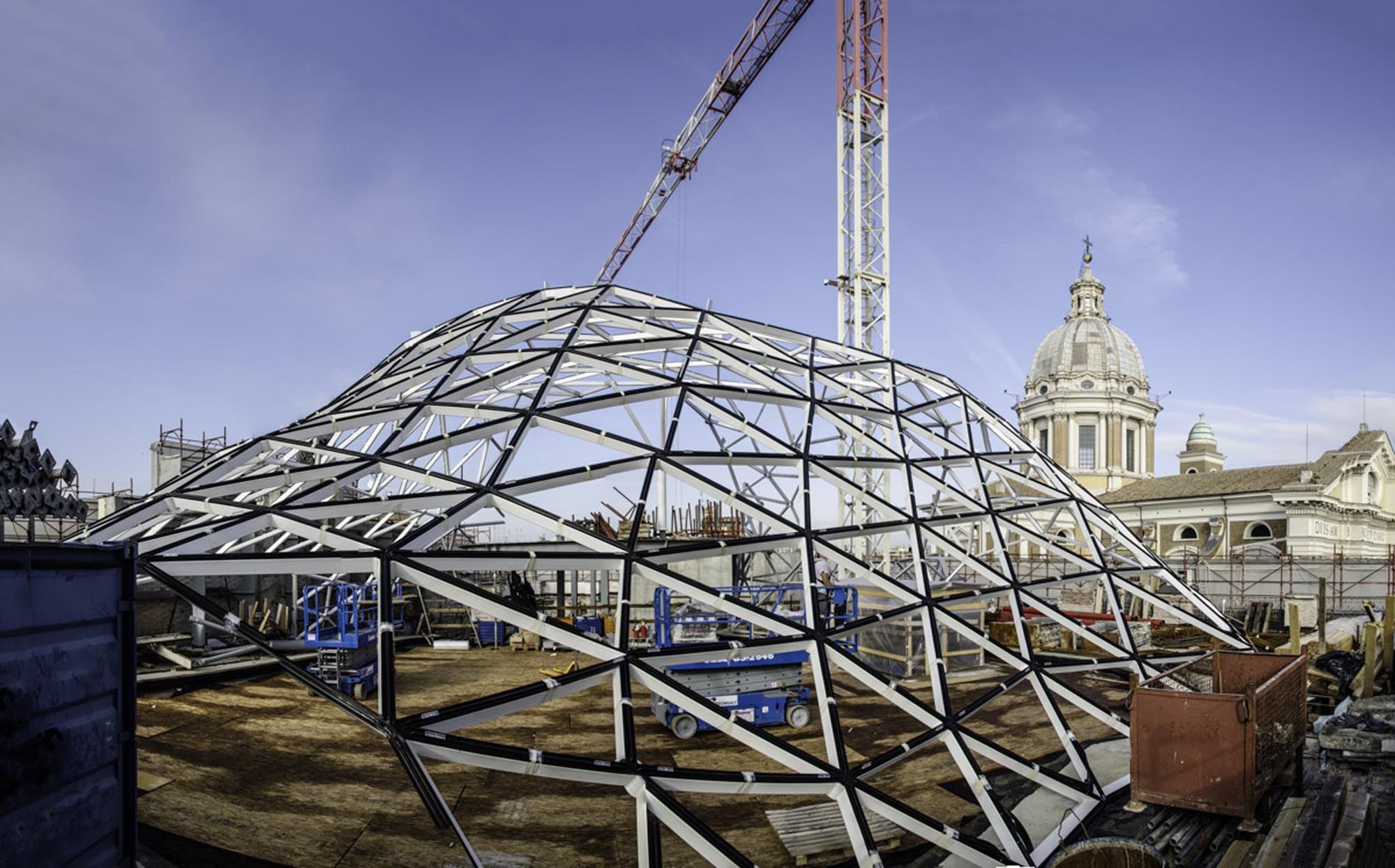 Een belangrijke wijziging betreft de constructie van de centrale staalconstructie die, vertrekkend van de onderkant van het gebouw, stijgt en de vier verdiepingen doorkruist, om bovenaan uit te komen bij de overdekking van een panoramisch terras van ongeveer 300 vierkante meter. Er zijn twee soorten glas gebruikt: zeer selectief dubbel glas voor de Nuvola en enkel glas voor de Lanterna; de twee beglaasde elementen bestaan uit ongeveer 1.000 driehoekige modules, elk met verschillende afmetingen, die ongeveer 2.000 vierkante meter beslaan. De toegepaste bouwtechniek is interessant: een structuur die zijn sterkte krijgt dankzij haar vorm, niet door de doorsneden van de profielen maar door het concept dat gebaseerd is op de gedrukte structuren die typisch zijn voor de oude Romeinse bogen. Meer in detail worden de glasoppervlakken ondersteund door stijve stalen staven, bestaande uit op maat gewalste profielen in S275 en S355. Het gebruik van het BIM-platform (Building Information Modeling), dat de samenwerking tussen opdrachtgevers en externe leveranciers bevordert en zo de uiteindelijke kosten drukt, was van fundamenteel belang voor het beheer van alle fasen van het proces, van modellering tot structurele berekeningen, van inkoop tot productie.