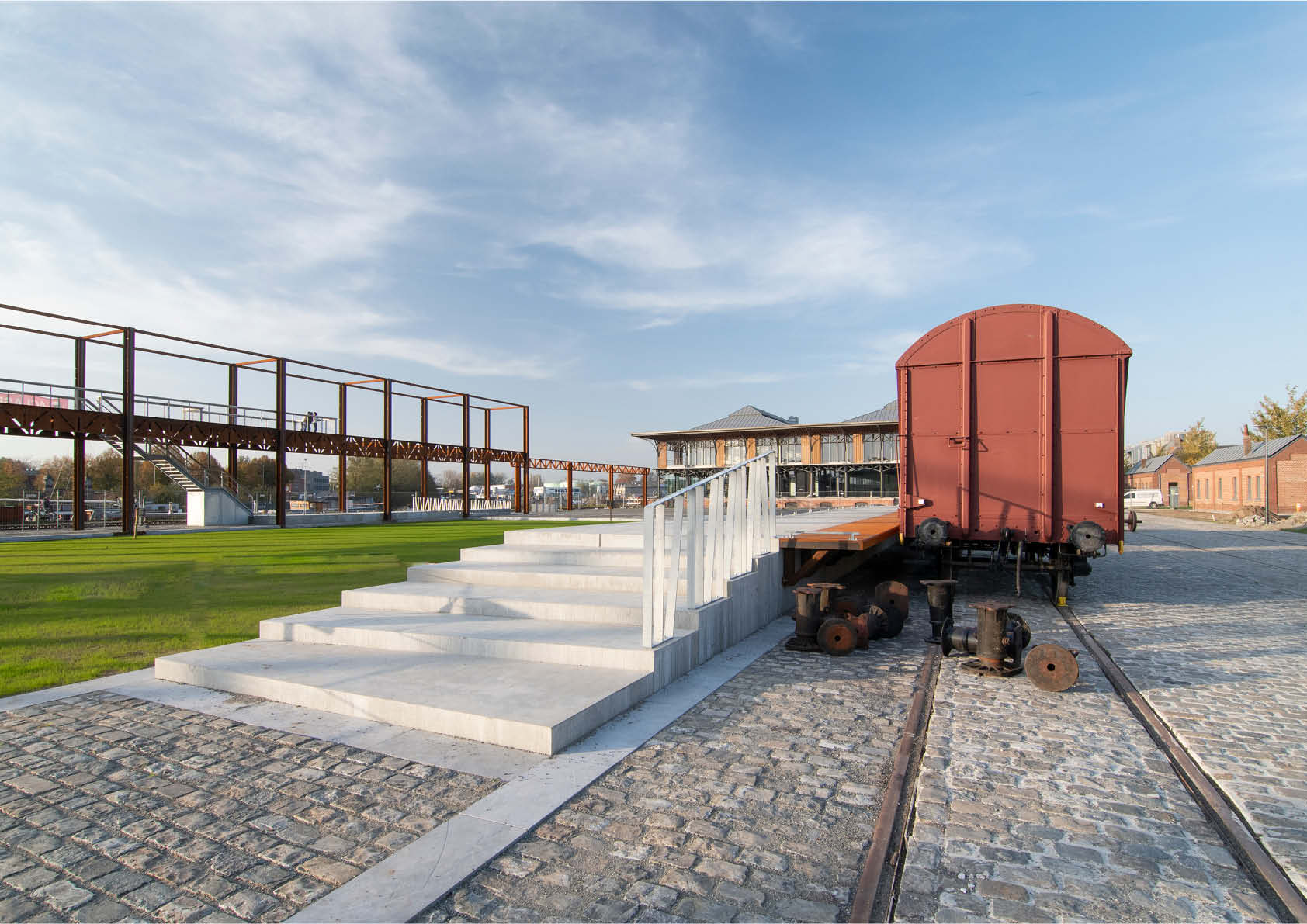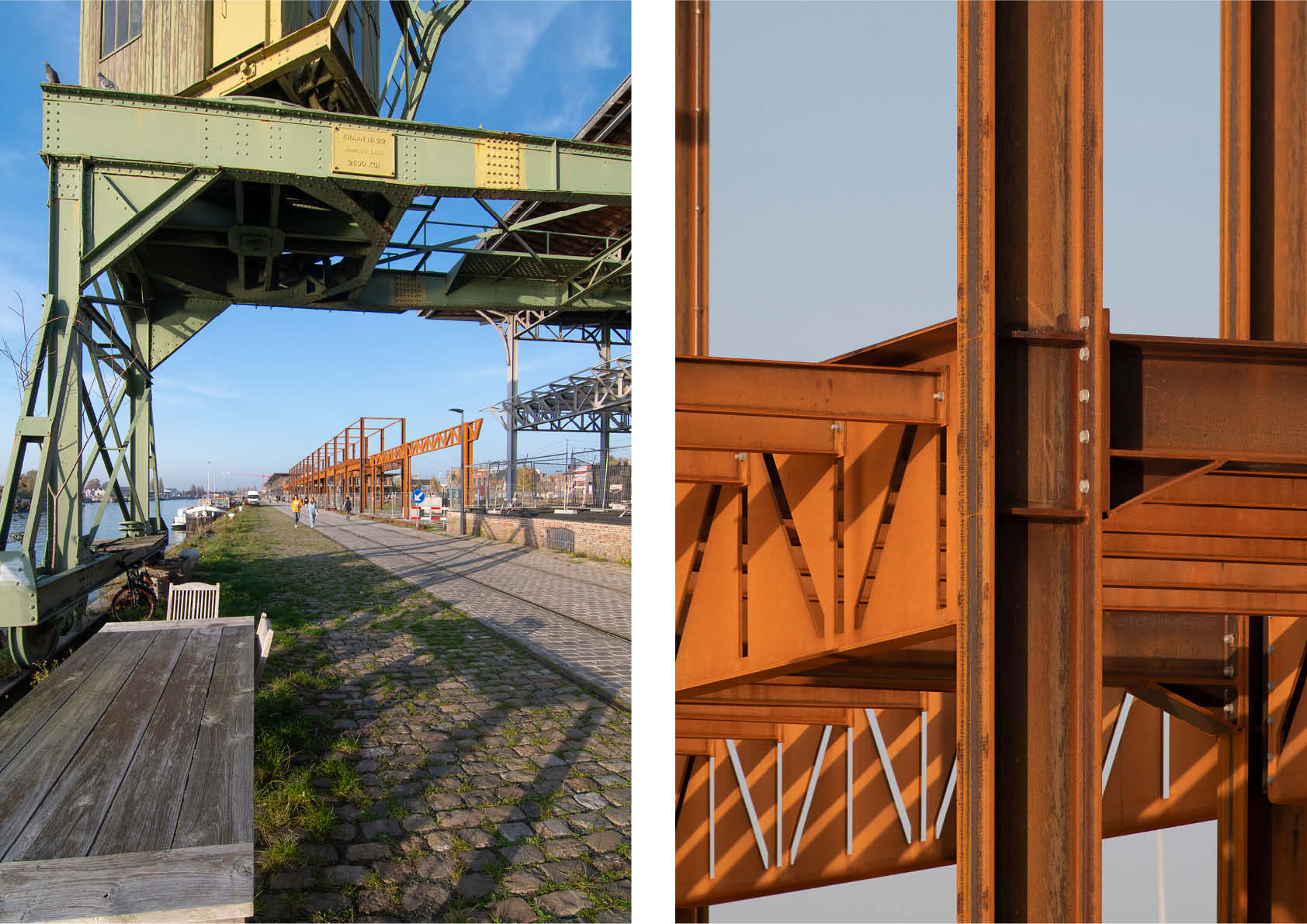 In het verlengde van de pergola, eveneens langs de kaaizijde, bevinden zich 2 lineaire tussenstructuren bestaande uit kolommen en vakwerkliggers met een overspanningen van zo’n kleine 10 m.