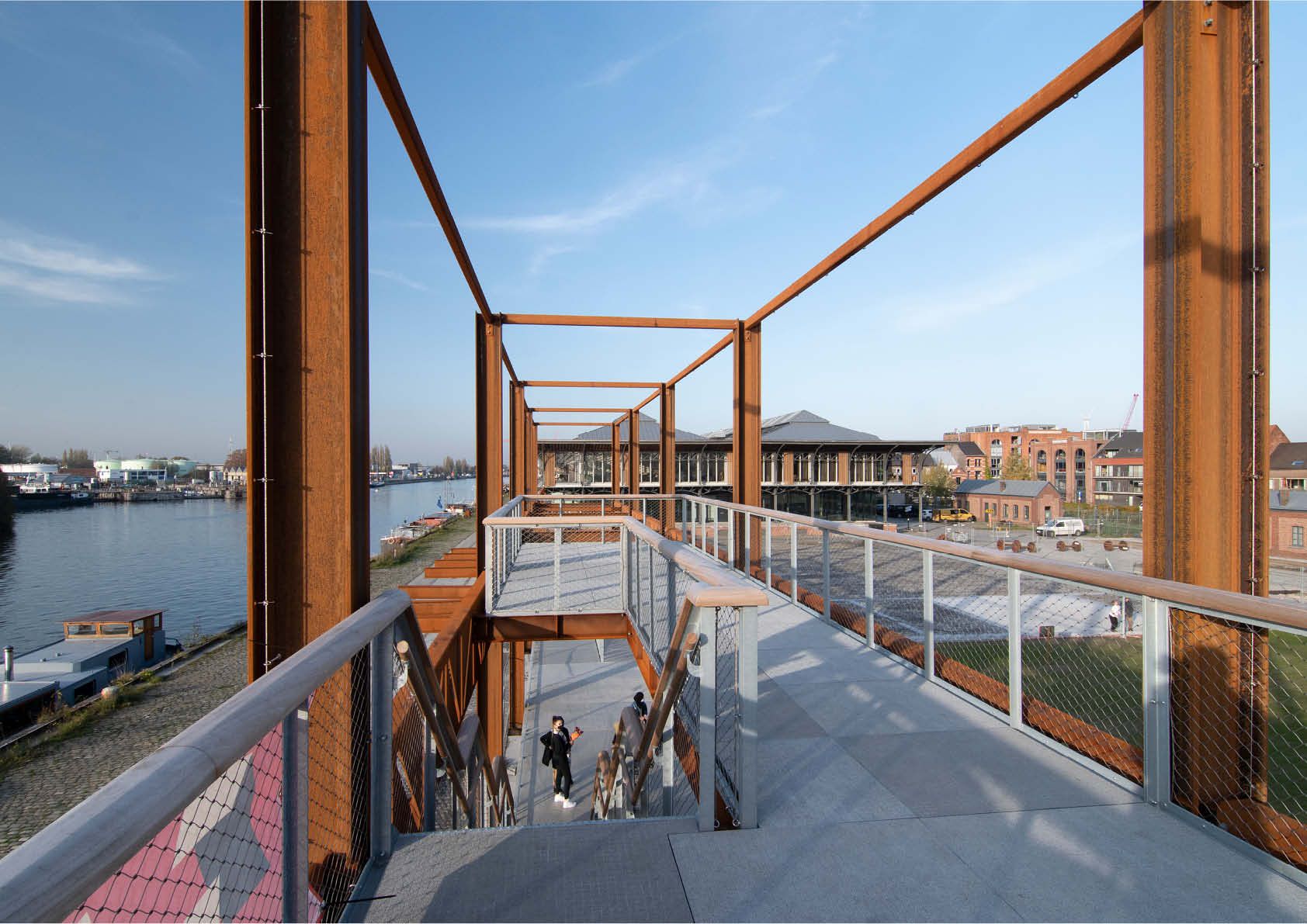 Aan de kant van de kaai werd een pergolaconstructie uit weervast staal geplaatst, met kolommen HE 400 A (corten-A). De pergola verwijst naar de structuur van de voormalige loods en herstelt op die manier het oorspronkelijk zicht van de Voorhaven.