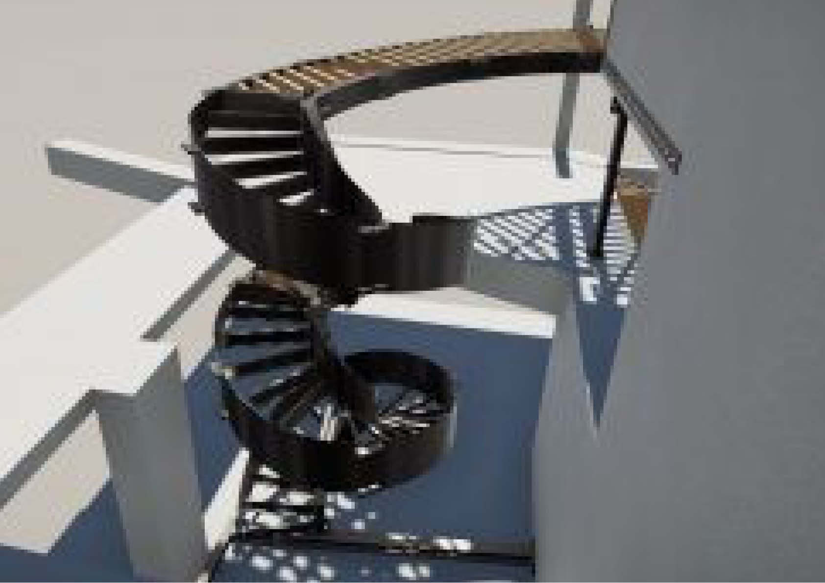 De nieuwe wenteltrap bedient verschillende niveau’s van een penthouse in een bestaand gebouw. De constructie omvat de ellips- en spiraalvormige trap met getorste platen alsook de verschillende niveau’s in het penthouse.