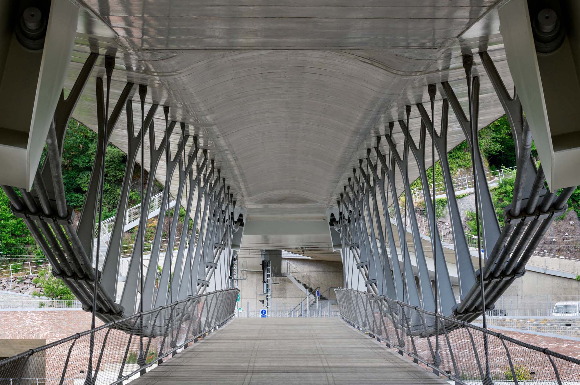 Hangende passerelle onder verkeersbrug