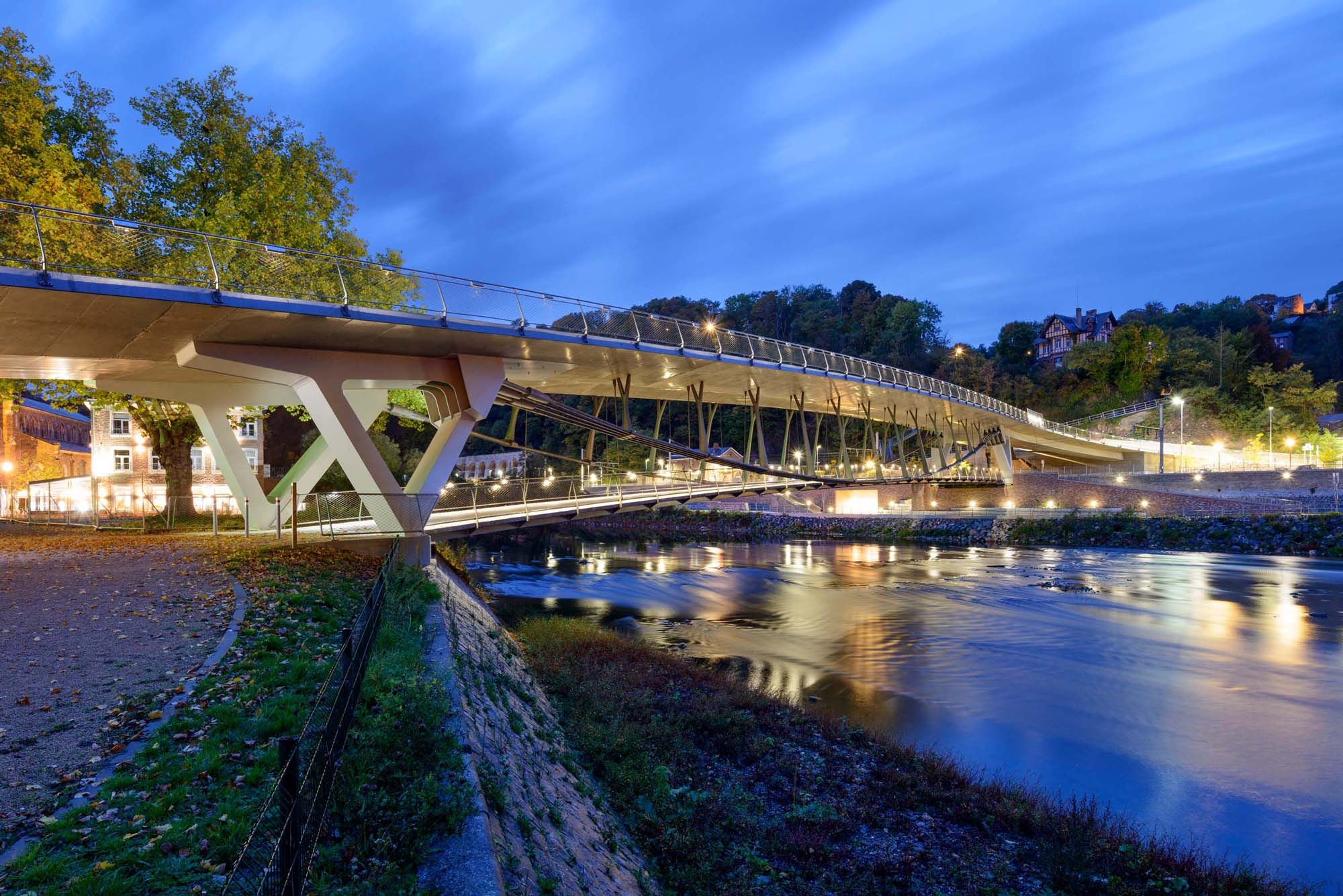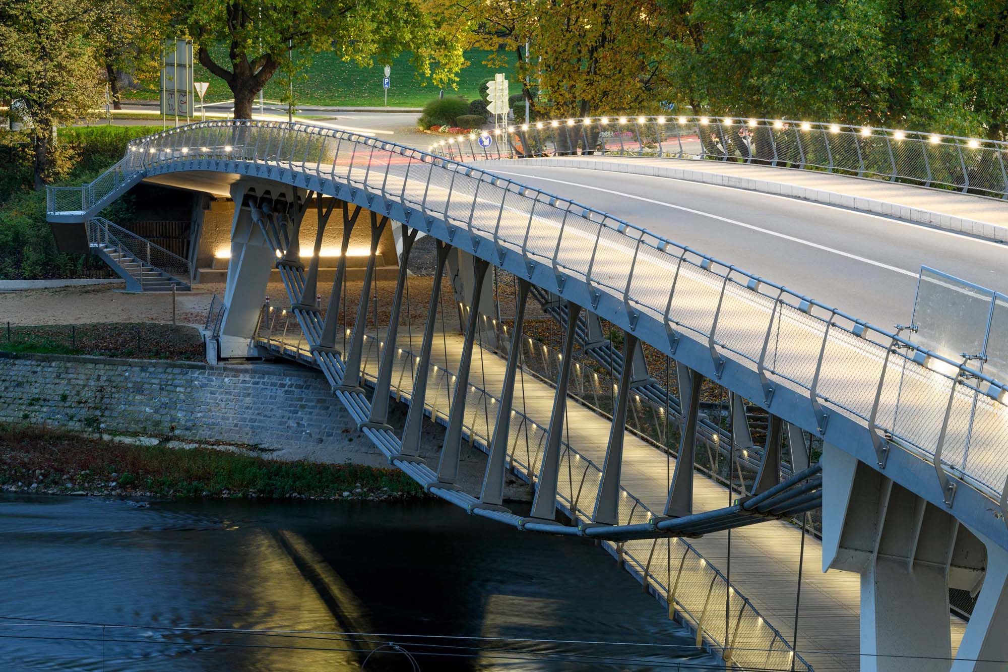 De nieuwe brug in Tilff, nabij Luik, over de Ourthe vormt een nieuwe multimodale verbinding voor de omgeving. Ze bestaat uit een verkeersbrug met een voetgangersbrug op een lager niveau.